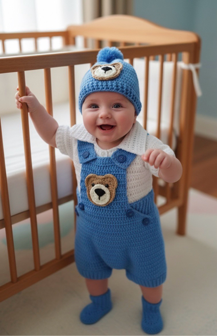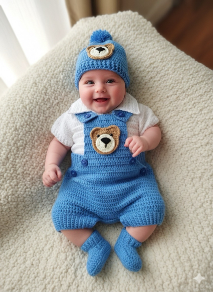 This charming baby outfit is a hand-crocheted ensemble, perfectly coordinated for a playful and stylish look! Here's a description of the "blue" colored version: The centerpiece is a delightful bright blue romper, designed with a classic overall style featuring short legs. It has a sweet teddy bear applique on the bib front, bringing a touch of adorable whimsy. This romper is layered over a crisp| Available for Cash On Delivery ? | Yes |