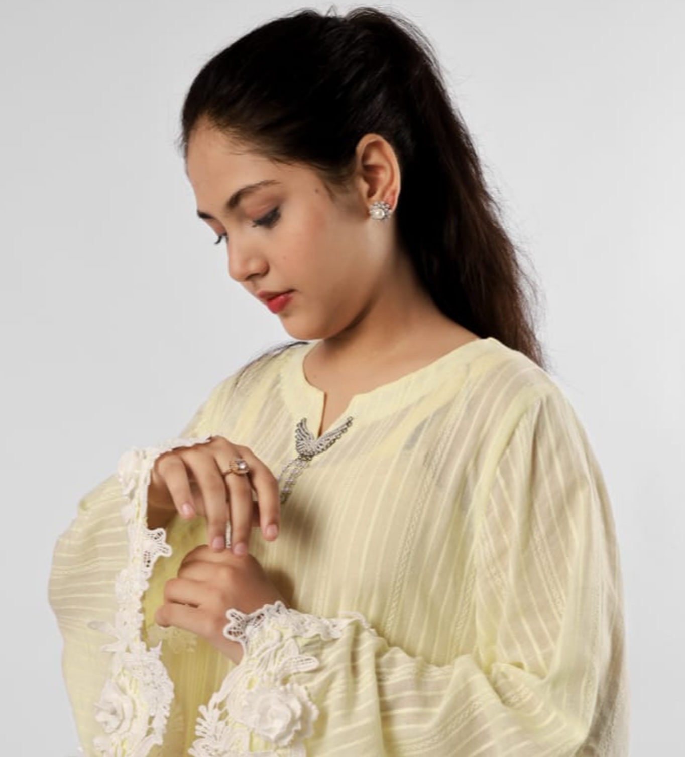 Fabric: Textured Cotton Lawn Color: Yellow Design: A-line Shirt and straight pants Details: Lace on Sleeves and daman with Scallops and brooch on necklineAvailable for Cash On Delivery ? | Yes |