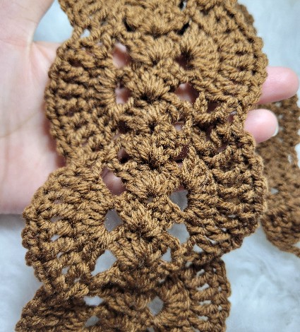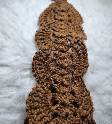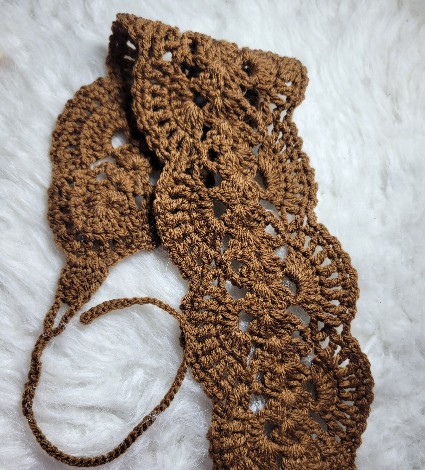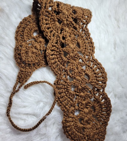 size: Adult color:customize made with imported wool This is a handmade crochet piece made with brown yarn. The design features scalloped, fan-like motifs worked in a repeating pattern, giving it a delicate and textured appearance. The motifs are joined together to form a continuous strip, and thin crochet ties extend from the ends, suggesting it could be worn as an accessory—such as a headband,| Available for Cash On Delivery ? | No |