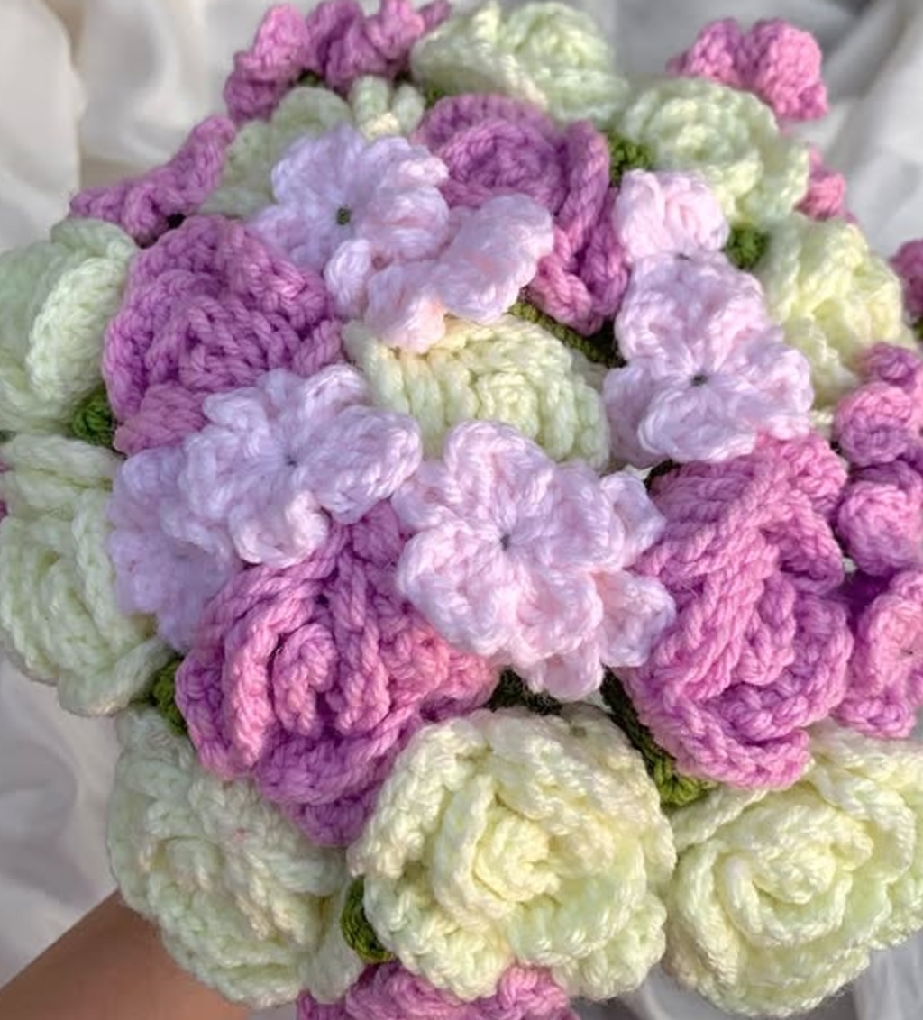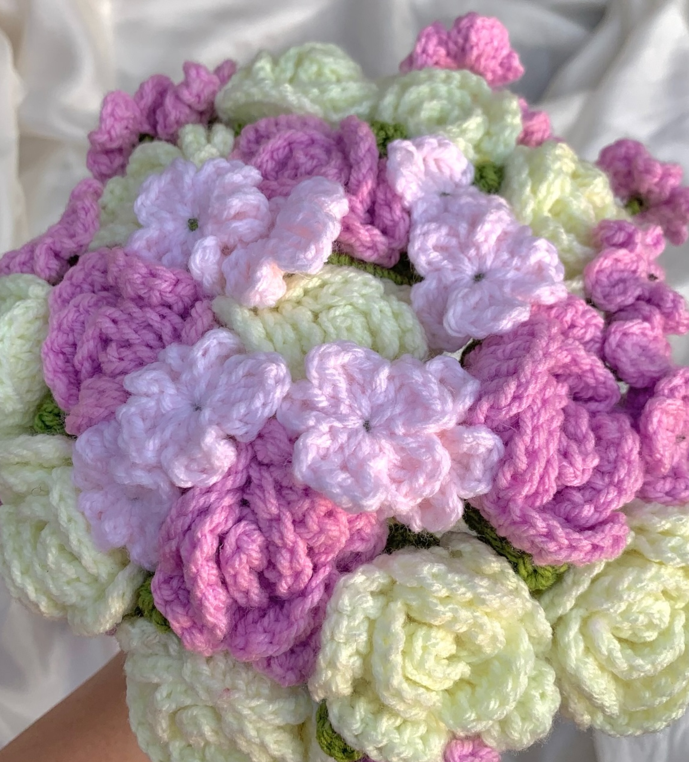 A bouquet featuring 10 light yellow roses and 4 purple roses — making a total of 14 small roses — beautifully paired with 6 Forget-Me-Not stems (4 purple and 2 pink). Please note that the pictures shown here are cropped; to view the bouquet more clearly and in full detail, visit our Instagram page @_crochetrella_| Available for Cash On Delivery ? | Yes |