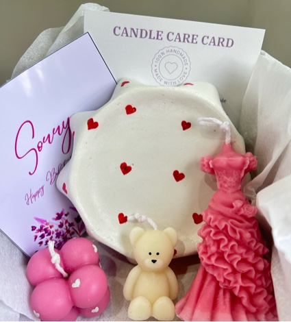 This gift box includes; hearts wavy tray + dress scented candle + teddy bear scented candle + bubble scented candle and a MESSAGE CARD. Once you place the order, our team will reach out to your WhatsApp number for customization or you can book your via instagram DM (@glimhomeco)Available for Cash On Delivery ? | No |