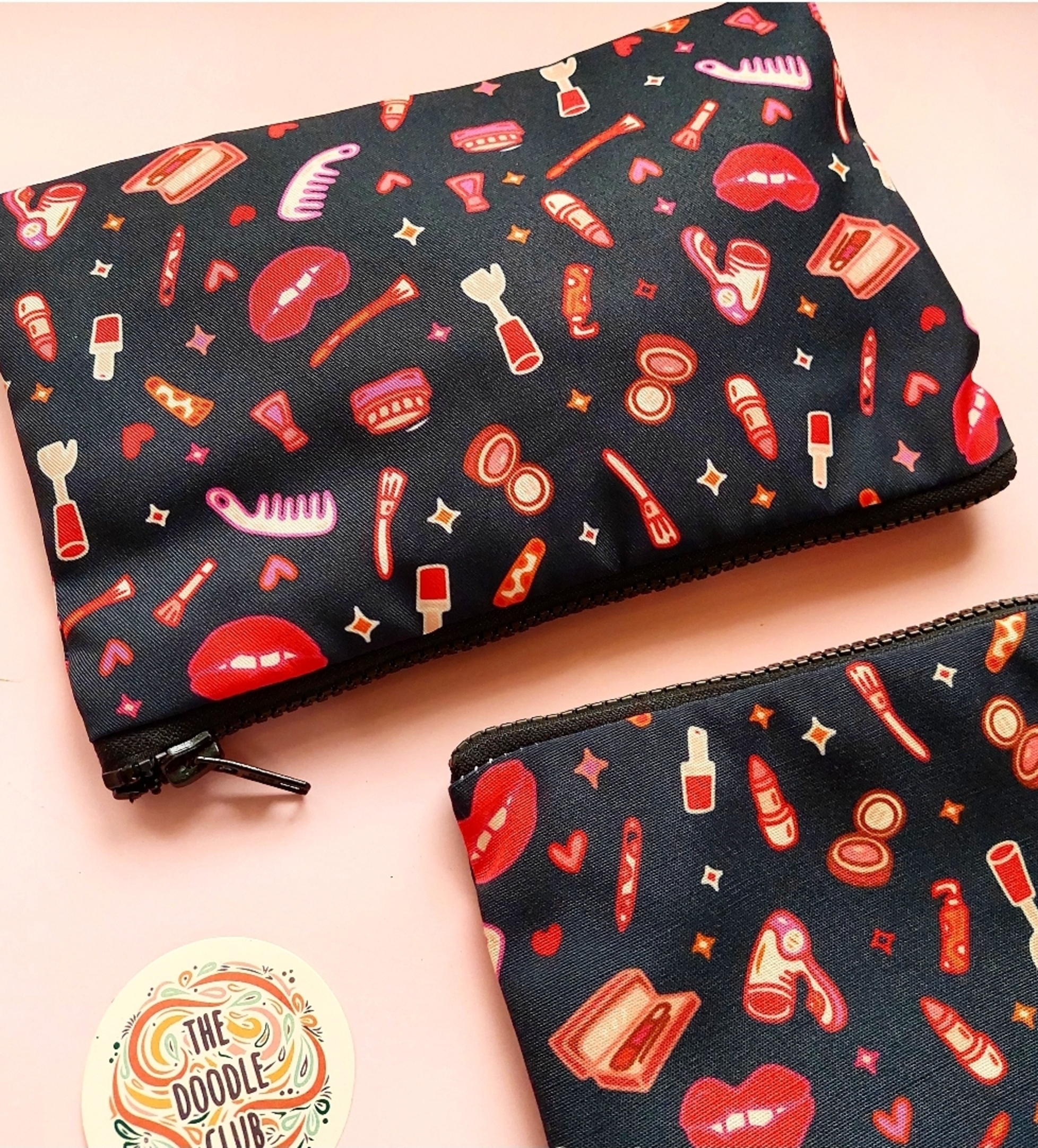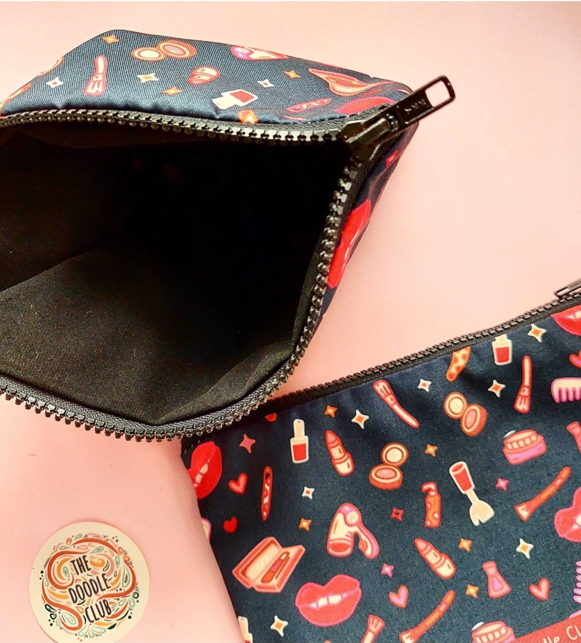 Size 5 x 9 inches approx. High quality smooth zipper. Black velvet lining inside. Digitally Printed Pouches Perfect for storing your makeup, stationery, medicines, vanity kit for travel, or just about anything small and cute! Designed by The Doodle Club. Made in Pakistan.| Available for Cash On Delivery ? | Yes |
