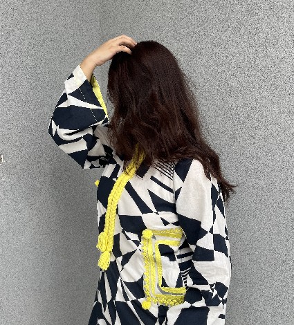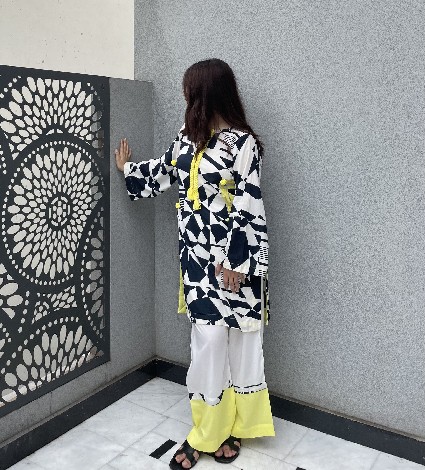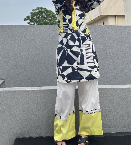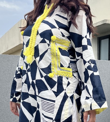 The attire is a two-piece outfit. The top showcases a monochrome blue and white pattern with yellow highlights, yellow yarn braids embroidered pockets with pom pom enhancing the overall appearance of this digital print. The bottom is white, with yellow accents at the bottom.| Available for Cash On Delivery ? | Yes |