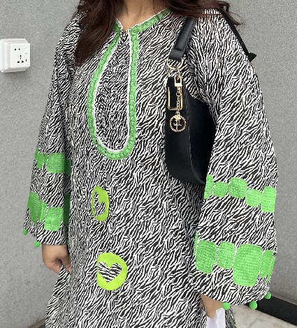Featuring a black and white zebra print. The sleeves and hem are highlighted with bright green accents, adding a pop of color and visual interest. White pants, offering a clean contrast to the patterned top. The pants are trimmed with the same vibrant green as the tunic. The outfit combines a bold print with clean lines and a fresh color palette. The zebra print adds a touch of the exotic, while| Available for Cash On Delivery ? | Yes |