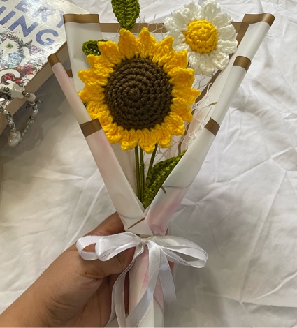 handmade cute bouquet. including 1 sunflower, 1 daisy flower and 1 leaf branch with pink wrapping